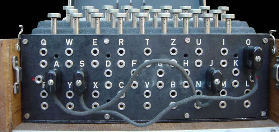 El panel de clavijas (Steckerbrett) era un conjunto de las veintiseis letras que podían ser puenteadas por medio de unos cables (venían diez con cada máquina) que servían para puentear una letra con otra. Como ejemplo, si conectáramos la F con la R, al teclear una de ellas, sería enviada a los rotores la otra, con lo que aumentaba la complejidad del cifrado. Con todos estos sistemas, se garantiza que una letra no puede ser cifrada como sí misma. |