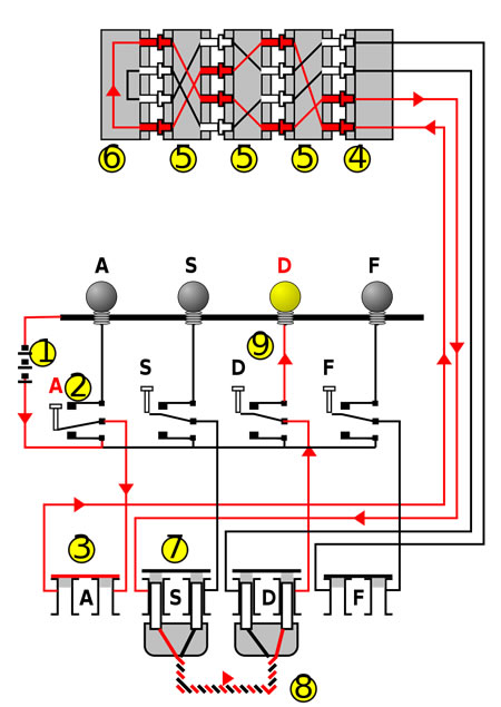 (Suponiendo colocados los rotores I, II y III.) La señal viaja de derecha a izquierda, y el reflector la devuelve de izquierda a derecha. Su viaje es: teclado, rotor III, II, I, reflector, rotor I, II, III y panel de luces. Supongamos una Enigma con el reflector B, y los rotores I, II y III, puestos con la clave inicial AAA, y sin puentes en el Steckerbrett. Tecleamos la letra A. (Muy importante, al pulsar la letra, el rotor III ha avanzado mecánicamente a B, con lo que en realidad se cifra con la clave AAB, pero se considera la clave anterior, pues es la que se puede visualizar en las ventanas) Al haber girado el rotor III, con la fuerza de la pulsación, nuestra A entra por la B, que devuelve la D. Entra en el II, no por D sino por C (recuérdese el desplazamiento), y nos devuelve la D. En el I la D nos da la F. En el reflector, la F se refleja de vuelta a los rotores como S. En el I, la S vuelve como S. En el II, la S pasa a ser una Z. Y en el III, la Z devolvería la O, pero como ha girado un grado, nos da la B. |