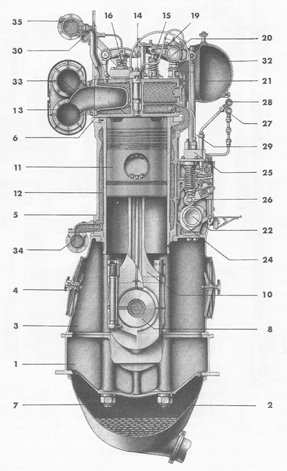 ![]() Corte de un cilindro 40/46 que aunque corresponde al modelo sobrealimentado, es muy similar al de aspiración natural salvo por la admisión de aire (marcas 13 y 33) |