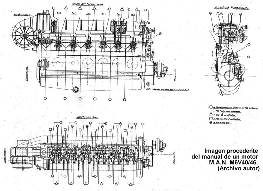 ![]() En la imagen superior podemos apreciar el tamaño de un motor M.A.N. M6V40/46 |