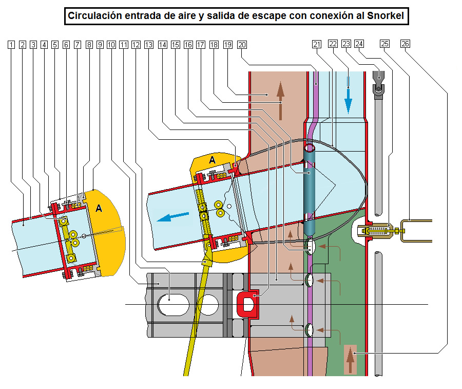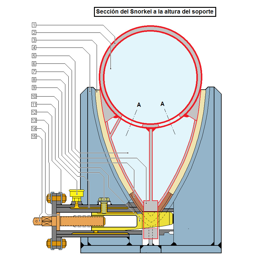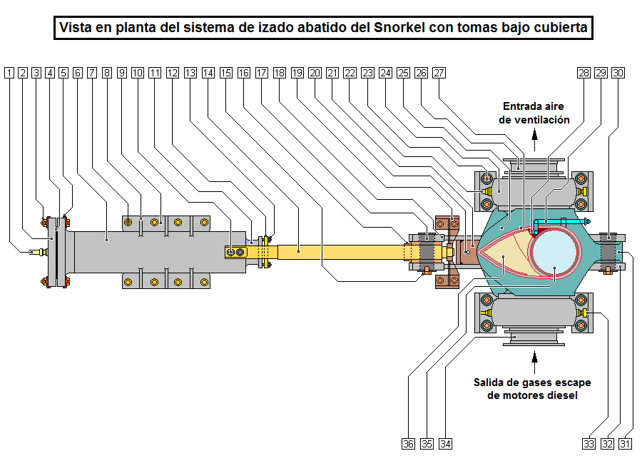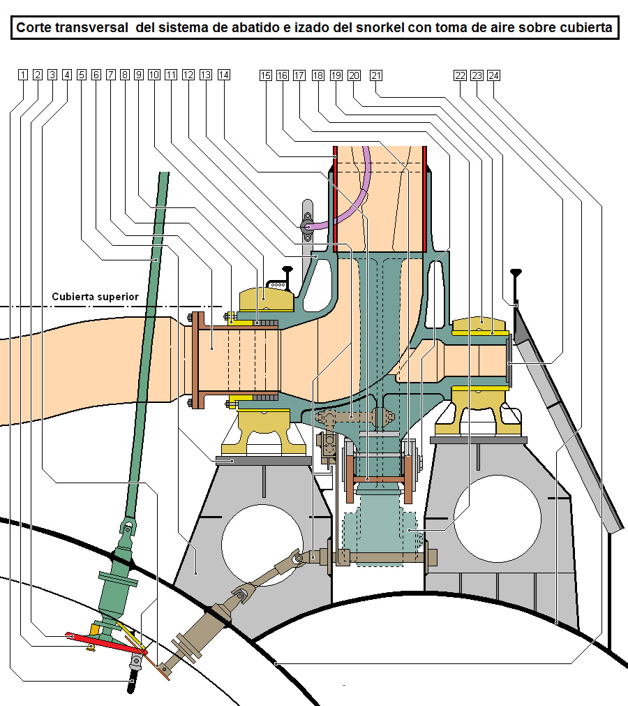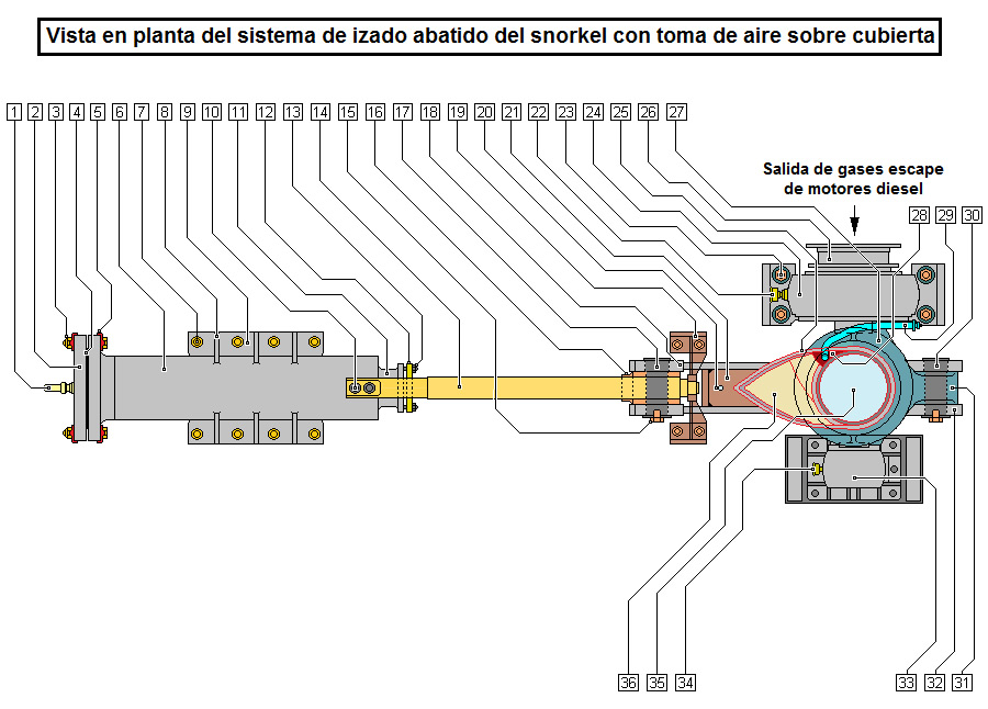 | Corte transversal del sistema de abatido/izado del schnorchel en el "modelo 1" |