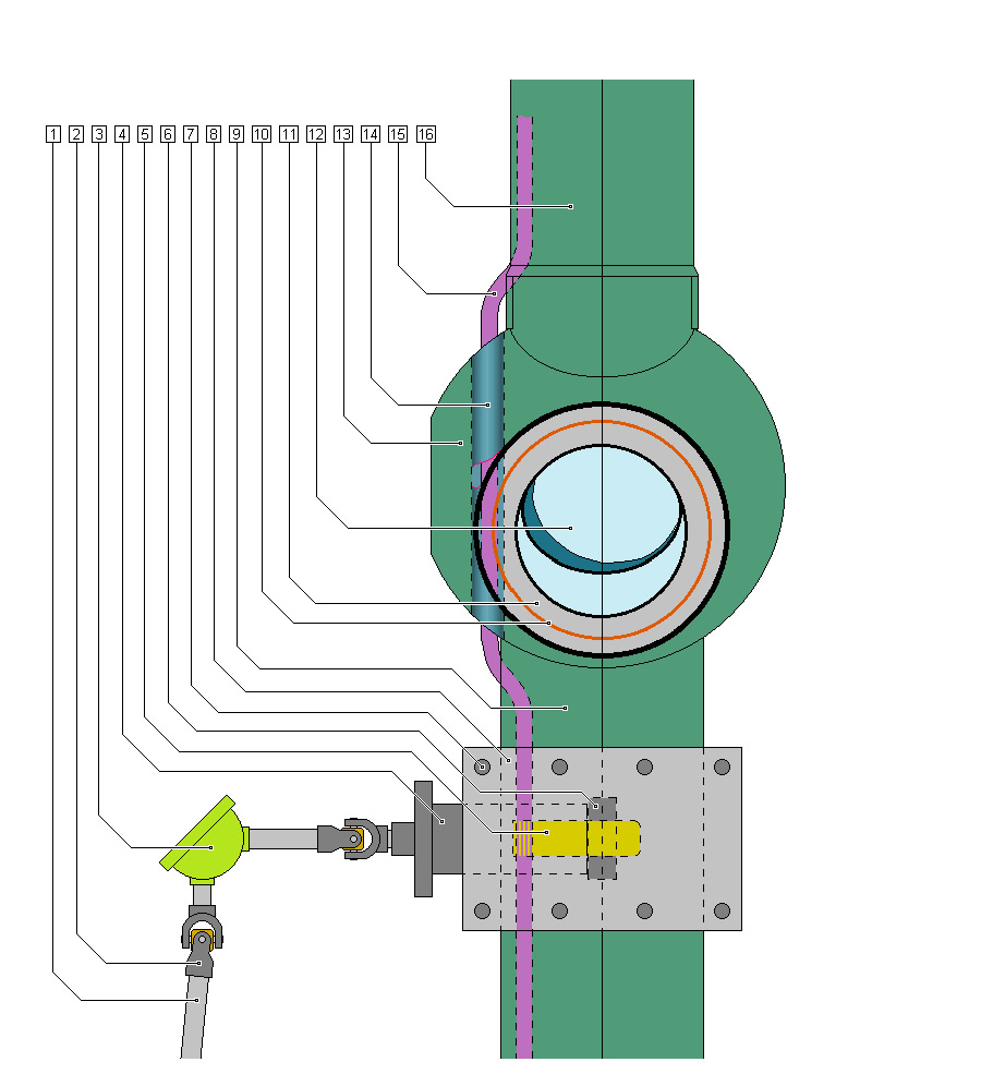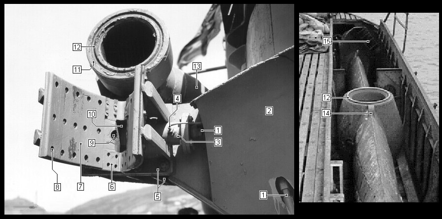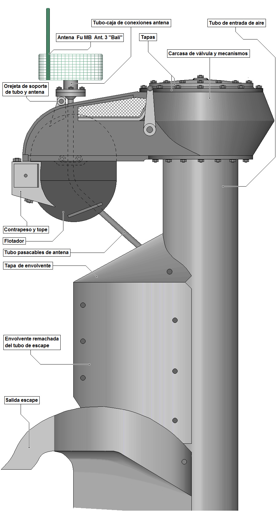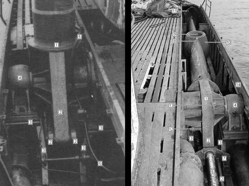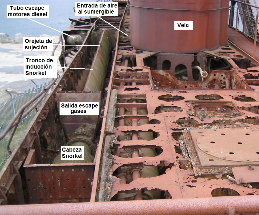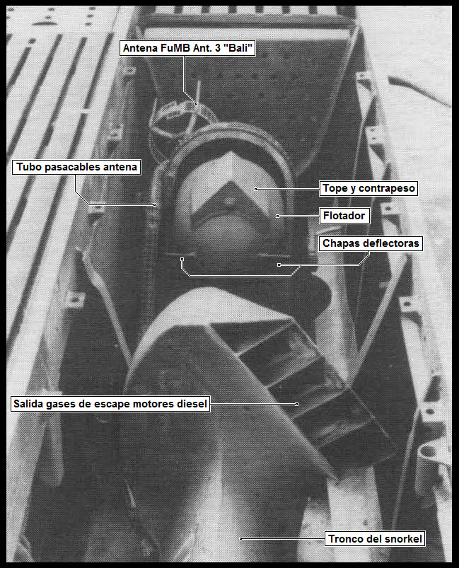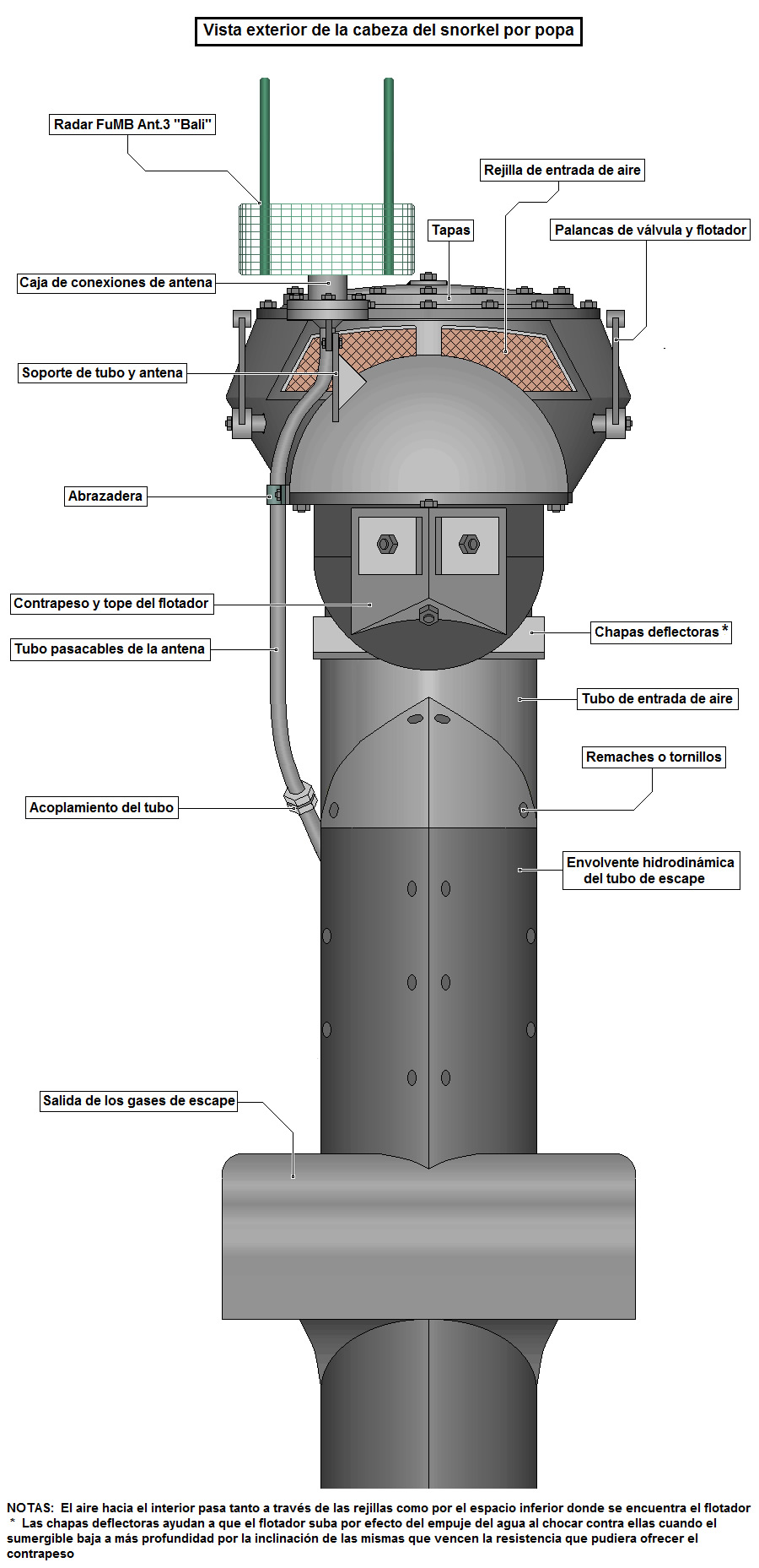 A la izquierda: Vista de la base del schnorchel con el sistema izado para toma de aire sobre cubierta. 1 - Base schnorchel; 2 - Brazo y bielas; 3 - Polín; 4 - Cojinete de apoyo y giro; 5 - Tubo de los cables de antena; 6 - Barra de guía del vástago; 7 - Soporte de la barra de guía del vástago; 8 - Orejeta de trincado; 9 - Toma de aire; 10 - Bulbo paso de gases de escape; 11 - Cabeza del schnorchel y salida de escape de gases; 12 - Eje de brazos articulados del índice; 13 - Engrasador; 14 - Costado. |
