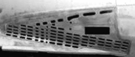 | Los tres agujeros estaban situados justo por encima de la parte trasera de los tanques de lastre. Su forma era alargada. |