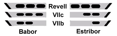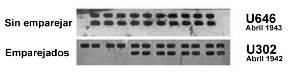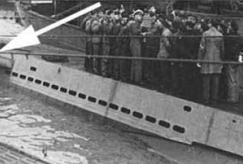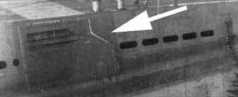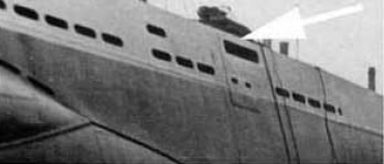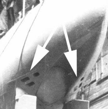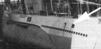 También cabe recalcar que el tercer agujero de la banda de babor está un poco separado de los otros (como si fueran aparejados). Las primeras series de los Tipo VIIb tenían sólo un agujero en la banda de babor (dos en la de estribor). |