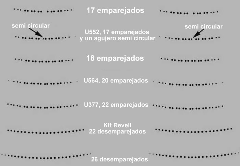 Sólo un grupo de uboote tenían estos agujeros emparejados, fueron los construidos en los astilleros Blohm & Voss como por ejemplo los U552, U556 y U564. Se escogemos uno de los uboote anteriores para modelar nuestro uboot es posible alterar el patrón original del Kit Revell para emparejar los agujeros. Uno de los errores más importantes del Kit Revell son precisamente estos agujeros. En el Kit son demasiado grandes. También en el Kit Revell esta línea de agujeros está situada demasiado hacia la proa. Estos errores son fáciles de corregir, simplemente hay que rellenar los agujeros existentes y taladrar el esquema que más nos convenga. |