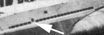 En el caso de querer modelar al U995 será necesario taladrar estos agujeros aunque, por otra parte no aparecen en otros tipo VIIc posteriores. La flecha de la derecha señala un grupo de agujeros más pequeños que el resto y que se pueden encontrar en varios tipo VIIc, pero no en todos. Por encima y por delante de los agujeros se encuentra el hidroplano de babor y su protección. |