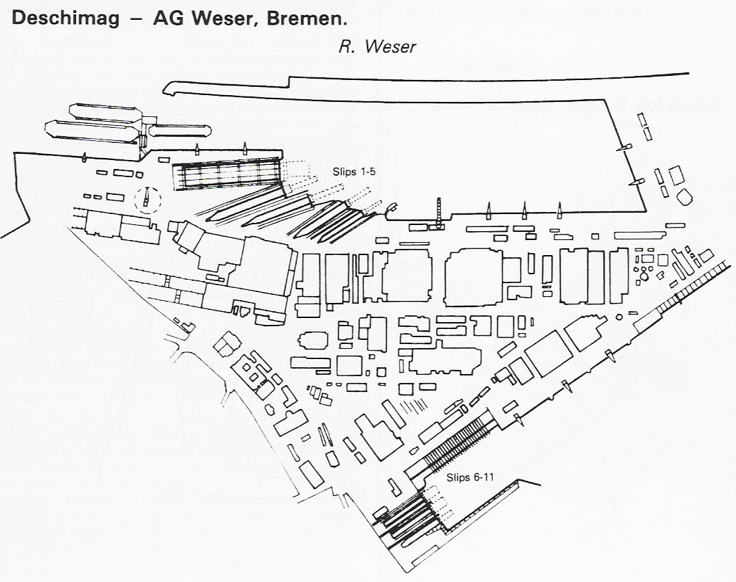 Estos astilleros fueron fundados el 8 de Noviembre de 1.843. Oficialmente llamados AG Weser en 1.872. Los astilleros iniciales se unieron a otros ocho astilleros, en 1.926, para formar la firma DESCHIMAG. |