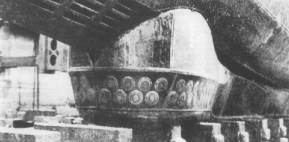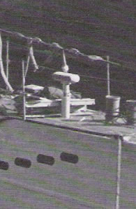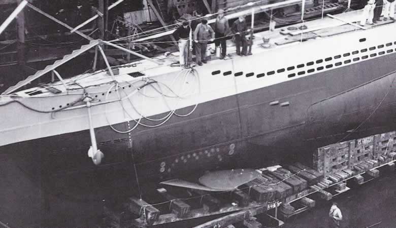Por encima del hidroplano del U99 podemos ver el grupo de transductores del Hidrófono. Loscuatro de mayor tamaño son los transductores del sistema de telefonía submarina. |