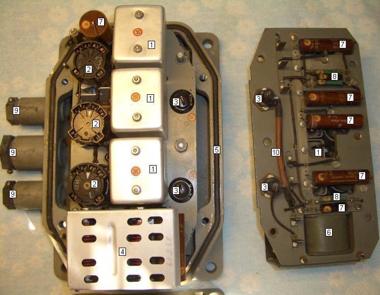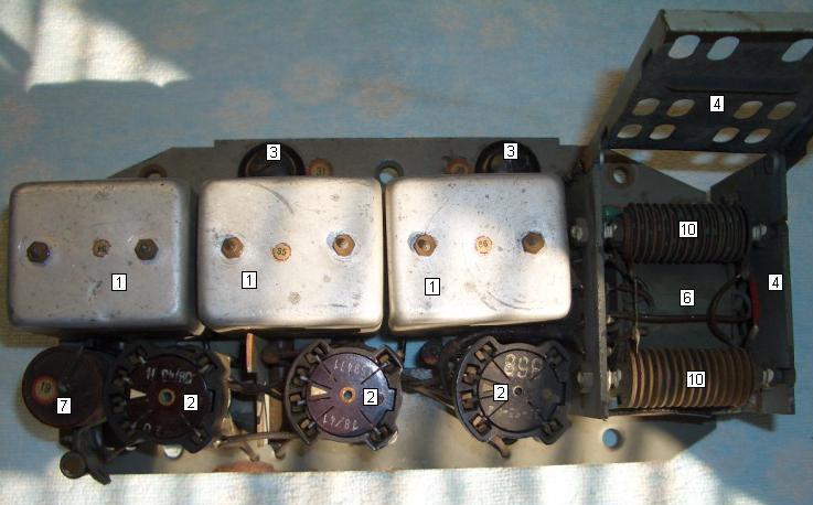 1.- Carcasa metálica que cubre las bobinas de Alta Frecuencia y los apantalla o blinda magnéticamente entre sí, con el fin de evitar las inducciones mutuas, 2.- Zócalos o bases para las válvulas amplificadoras, 3.- Cápsulas para fusibles, 4.- Caja y rejilla disipadora de la fuente de alimentación, 5.- Junta de goma tórica (en ésta foto no se ve), 6.- Transformador de alimentación, 7.- Condensador, 8.- Resistencias (en ésta foto no se ven), 9.- Pasantes de cable tipo "sici" (en ésta foto no se ven), 10.- Diodos rectificadores de la fuente de alimentación (los diodos parecen ser del tipo MOS > metal oxido semiconductor) |