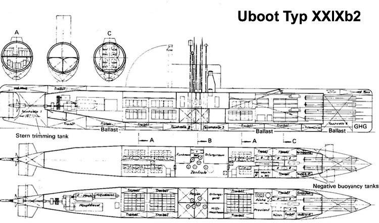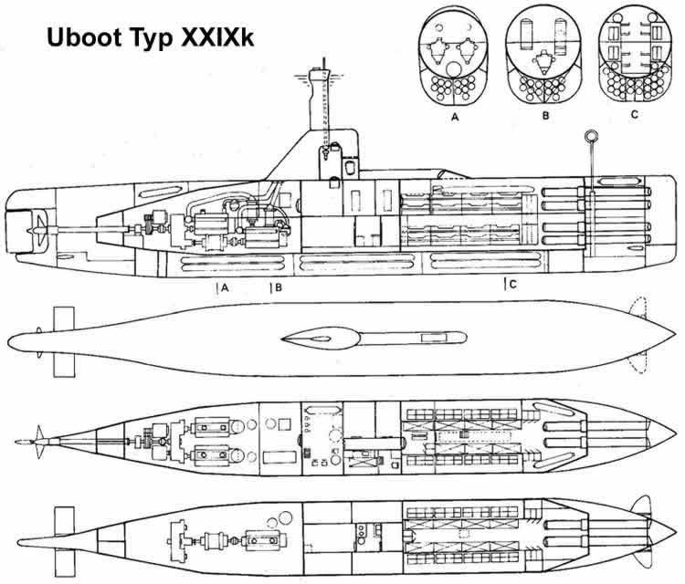 En los primeros meses de 1.944 se llevaron a cabo estudios para comprobar que cualidades mejorarían al incorporar una instalación diesel de circuito cerrado en los submarinos del tipo XVIIB y XXVI. Debido a la forma de sus cascos se consiguieron resultados poco satisfactorios ya que no era posible almacenar suficiente cantidad de oxigeno gaseoso. Otra investigación se desarrollo posteriormente, en el verano de 1.944, con 4 diseños basados en el Tipo XXIXB, los cuales se denominaron Tipo XXIXK1-K4. El, relativamente, gran volumen de oxigeno era transportado en botellas y, el peso de estas, hacían que el desplazamiento del submarino aumentase. |