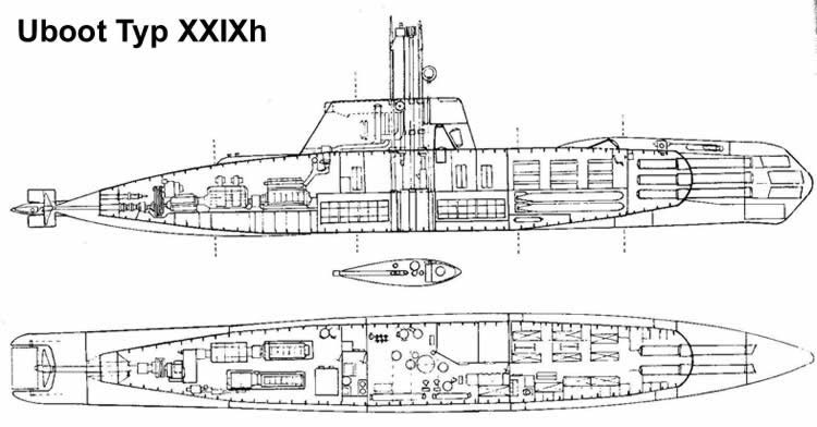 Una condición indispensable, en cuanto al diseño, era que deberían estar disponibles inmediatamente y, además, debían tener un armamento de 8 tubos lanzatorpedos. Se presentaron varios diseños, desde el modelo A hasta el D, la diferencia entre ellos era el tamaño y, por supuesto, sus características motrices. De estos se eligió como el mejor de todos al XXIX-B, sobre todo en su relación coste-ejecución. El tiempo de recarga de las baterías, 9 horas, era muy alto; la velocidad en inmersión, 15,4 nudos, era inadecuada. Para ello se incrementaron el número de celdas de las baterías y se coloco un motor diesel más potente, a este modelo se le bautizo como Tipo XXIX-B2. |