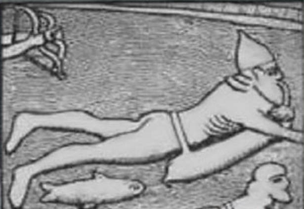 El primer dato o boceto sobre artilugios de buceo, está fechado hacia el siglo IX a.C. y se trata de un bajorrelieve Asirio, en el cual se puede ver a un buceador con una especie de odre o contenedor de aire, al que va colocado un tubo que por su otro extremo entra en la boca del supuesto buzo. |