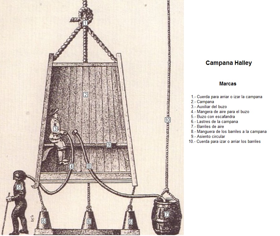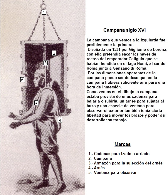 Estos ingenios consistían principalmente en campanas, más o menos grandes, que con ayuda de puntales a modo de grúas y lastradas con piedras o pesos, se sumergían en el mar con un hombre en su interior. El tiempo de inmersión estaba limitado por la capacidad de aire de la campana, por lo cual la profundidad no podía ser mucha. |