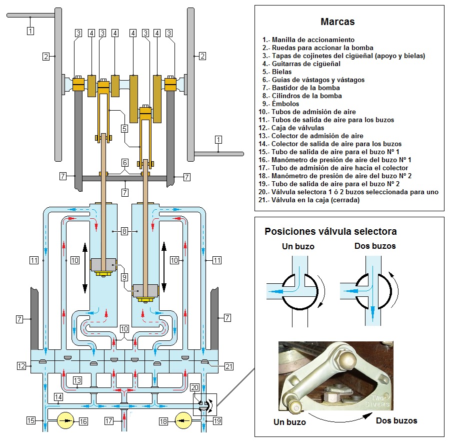 1.- Mangueras de aire desde la bomba de superficie al depósito 2.- Depósito de aire a 40 kilos de presión constante 3.- Regulador 4.- Manguera desde el regulador a la boquilla 5.- Escafandra 6.- Chasis de sujección de depósito y regulador 7.- Cinturón de sujección de manguera y herramientas.