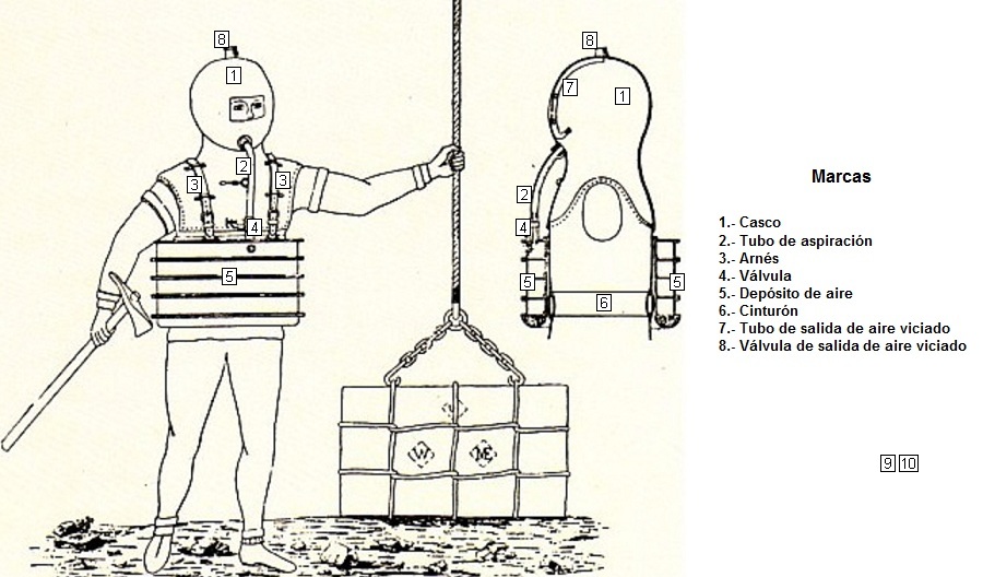 1.- Casco 2.- Peto de acero 3.- Grifo de emergencia 4.- Mirillas y marcos 5.- Banda para el atornillado del peto 6.- Gancho para sujetar la cuerda de izado en posición 7.- Pequeños cáncamos para sujetar y asegurar la manguera y la cuerda 8.- Aro de sujección del casco al peto (roscado a un octavo de vuelta) 9.- Estaquilla de acoplamiento para manguera de aire 10.- Tubo o conducto de aire hacia el casco 11.- Tapón de la toma para comunicación telefónica 12.- Conducto para el cable telefónico 13.- Regulador para válvula de descarga de aire viciado 14.- Conducto de aire viciado hacia la válvula y el exterior 15.- Tornillos para sujetar y fijar el peto al traje 16.- Palanca de bloqueo del aro de sujección