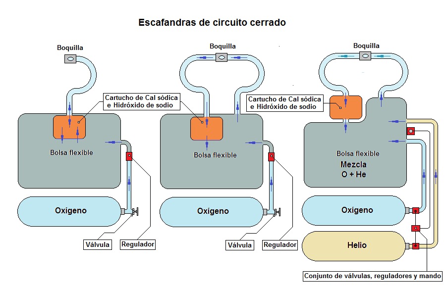 Buceadores de la Regia Marina Italiana Al comenzar la Segunda Guerra Mundial, los italianos ya están preparados para atacar a los británicos con sus torpedos tripulados, y ya disponen de equipos para sumergirse con ellos. Dichos equipos consiste en un traje de una pieza llamado “belloni” y pueden respirar a través de un aparato respirador de ciclo cerrado que los italianos llaman Autorespiratore a ossigeno. El aparato, al ser de circuito cerrado, no desprende burbujas ni deja rastros en la superficie, y consiste en dos cilindros de oxígeno a alta presión que proporcionan algo más de 6 horas de respiración. El oxigeno es aspirado por medio de una válvula reductora y un tubo flexible, y a través de la pieza o bocal que el submarinista mete en la boca, el aire exhalado va por el mismo tubo a un nuevo cilindro que contiene cristales de cal sodada en donde el aire viciado se va renovando.