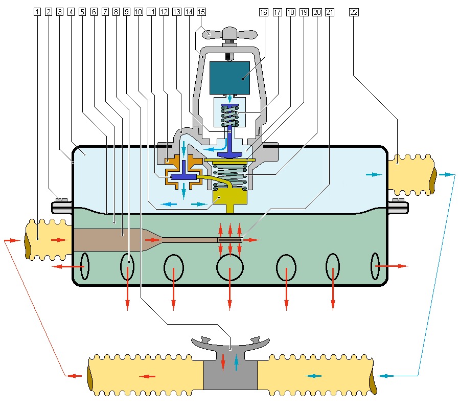 1.- Tubo de retorno de aire viciado al exterior 2.-Tornillo de acoplamiento entre cámara de baja presión (4) y cámara de salida (6) 3.- Carcasa del regulador 4.- Cámara de baja presión 5.- Membrana de baja presión 6.- Cámara de salida de aire viciado 7.- Válvula de no retorno tipo pico pato 8.- Orificios de salida de aire viciado al mar 9.- Boquilla del buceador 10.- Tope y leva que accionan la válvula de baja presión (11) 11.- Válvula de baja presión 12.- Cuerpo de la válvula de baja presión 13.- Cuerpo o chasis de los mecanismos del regulador 14.- Válvula de alta presión 15.- Mariposa y abrazadera de sujección 16.- Cabezal de la botella 17.- Muelle de la válvula de alta presión (14) 18.- Cámara de alta presión 19.- Membrana de alta presión 20.- Muelle entre la membrana de alta presión (19) y la leva de baja presión (10) 21.- Salida de aire viciado a través de la válvula de no retorno pico de pato (7) 22.- Conducto o tubo de aire oxigenado de aspiración hacia la boquilla (9) |