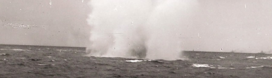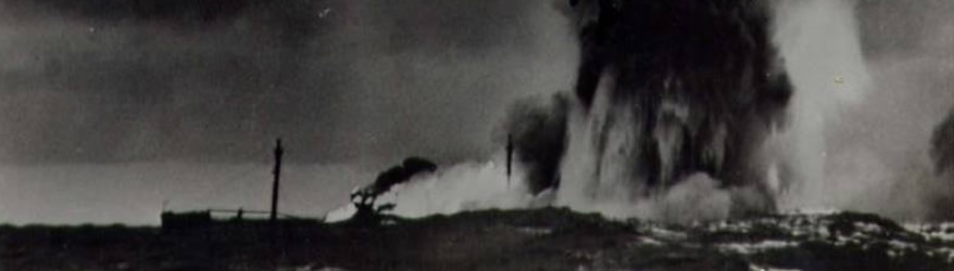 El Comandante sujeta el timón con firmeza. El u-boot se aparta para poder disparar uno más desde el tubo de popa al quinto buque. Justo cuando la orden de “¡fuego!” es dada, una llamarada surge en el otro lado. Una explosión resuena. Un barco de 5.000 toneladas ha sido tocado. De nuevo otras dos explosiones, una columna de fuego brota de repente, el segundo y tercer torpedo han alcanzado mortalmente al mismo carguero. Se parte en dos y se hunde. |