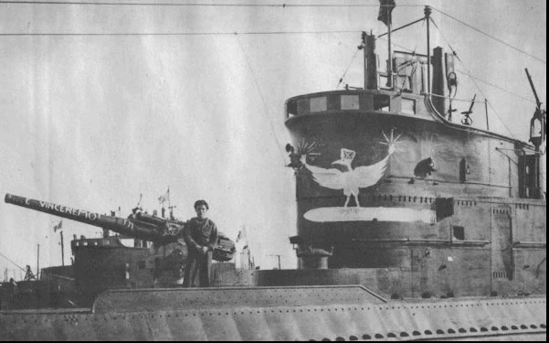 ![]() “En esta foto se ve la falsa torre del Pier Capponi con el anagrama del gallo con las campanas en las alas y agarrando un torpedo con las garras, este fue diseñado al regreso de su primera misión de guerra por el STV Franc Fiaschi.” |