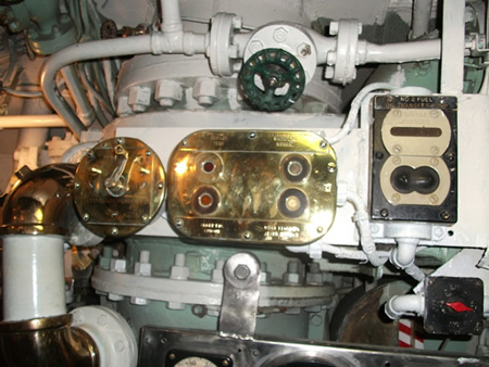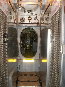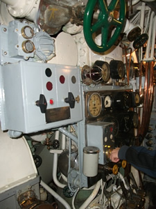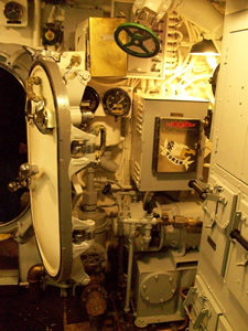 La anécdota del día nos la ofreció una señora, todos sabemos que en el interior de un submarino hay que tener cuidado con la cabeza, hay muchas piezas que están expuestas en el pasillo y hay que tener cuidado. Yo, a mis acompañantes les dije que tuvieran “cuidado con la cabeza”, hubo varios que me preguntaron: ¿por qué, si no hay “hierros” que crucen el pasillo?....y en unos minutos, la señora mencionada tuvo que salir con una brecha en la cabeza. Que se la hizo en la sección de los motores diesel al salir de la puerta hacia proa. Hay que decir que las escotillas de paso, son ovaladas y no redondas, y aunque parezcan más grandes, tienen su truco. |
