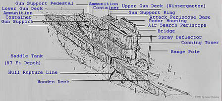 Ante mi estupor, ¡David se sumergiría de inmediato vestido con pantalones tejanos y un polo!. Un poco después, al regresar David, buceé en compañía de Ray, descendiendo por el cabo de sujeción de la boya. Al llegar al pecio exploramos la torreta donde era posible ver las bases de los periscopios de ataque y de observación, también se apreciaban varios detalles más. Para identificar los distintos elementos me ha venido muy bien las cientos de horas que he pasado montando maquetas de uboot. |