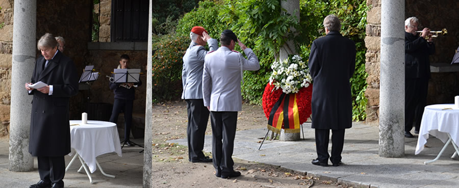 El responso corrió a cargo del sacerdote castrense católico Sr. Scheifele, así como del párroco de la Parroquia Evangélica de Habla Alemana de Madrid, Sr. Büttner, tras el cual el Embajador de Alemania en España, Excmo. Sr. Silberberg, dedicó unas palabras al recuerdo de las víctimas de las guerras, recordando igualmente a los soldados, aviadores y marinos alemanes y españoles fallecidos en las diversas misiones de mantenimiento de la paz, que actualmente se desempeñan por el mundo. |