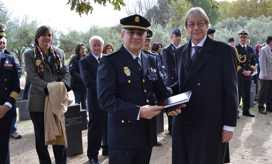 Tras el discurso llegó el momento de hacer la ofrenda floral, la cual corrió a cargo del Embajador Sr. Silberberg, del Agregado de Defensa Coronel Schraeder y del General del Ejército alemán Sr. Fischer que hicieron entrega de una corona de flores adornada con la bandera de Alemania, acompañado por el quinteto de viento proveniente del Colegio Alemán de Madrid que puso igualmente ritmo a los cánticos religiosos. Unos cincuenta minutos después del inicio, finalizó el acto de una manera sorprendente, al menos para mi, pues el señor embajador tuvo el detalle de agradecerme, frente a las personalidades que allí se habían congregado, el esfuerzo realizado para recordar por siempre la memoria de los soldados, marinos y aviadores alemanes caídos en ambas guerras mundiales, recogido en el libro “El Cementerio Militar Alemán de Cuacos de Yuste”, del que soy autor junto a Javier Verdú y a Agustín Ruzafa. Asimismo me hizo entrega del ejemplar número cero, de una tirada limitada financiada por la embajada, uno de cuyos volúmenes fue enviado al Presidente de la Comisión de Conservación de Tumbas Militares Alemanas Sr. Reinhard Führer (que ha tenido la gentileza junto al señor embajador de prologar el libro), para que lo custodiara a disposición de los familiares de los militares enterrados en España. |