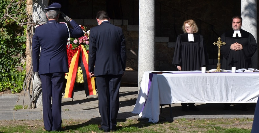 Para finalizar recordó a los militares, policías y guardias civiles alemanes y españoles que fallecieron en misiones de paz en aquellos países en los que se encuentran desplegados defendiendo las libertades y dando ayuda humanitaria en Irak, Siria, Afganistán, Oriente próximo y Ucrania entre otros y agradeció la presencia de los asistentes. Posteriormente se rindió honores a los fallecidos con la entrega de una corona de flores adornada con los colores de la bandera de Alemania. |
