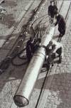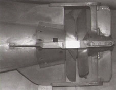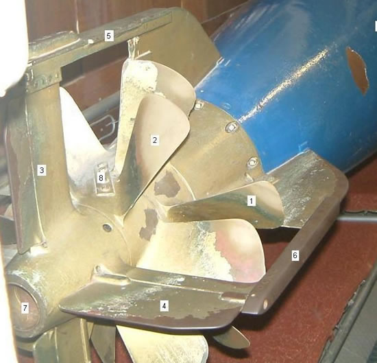 1.- Hélice de proa gira en sentido de las agujas de un reloj. 2.- Hélice de popa gira en sentido contrario a la anterior para contrarrestar los efectos de ella. 3.- Deriva vertical con el timón de dirección. 4.- Deriva horizontal con el timón que regula la profundidad. 5.- Sección hueca que alberga las varillas que mueven el timón de dirección. 6.- Sección hueca que alberga las varillas del timón de profundidad. 7.- Salida de gases o residuos de material combustible que mueve el motor. 8.- Seguro que evita que las hélices giren mientras se manipula el torpedo. Se desmonta poco antes de introducirlo en los tubos. |