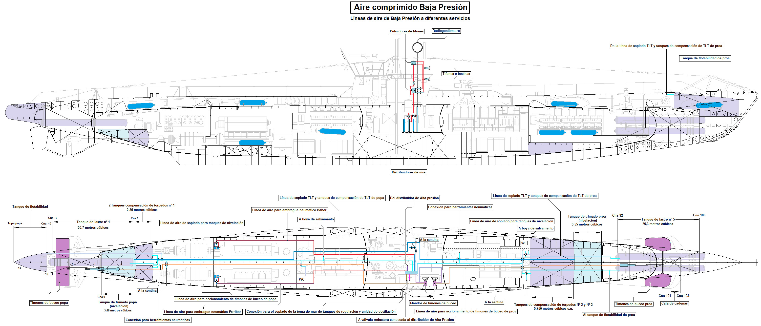 Para soplar los tanques de regulación, tanques de regulación y reserva de combustible y tanques de flotabilidad negativa, hay instalado un colector de soplado en la sala de control. Las válvulas de seguridad para los tanques de regulación, tanques de regulación y reserva de combustible, se fija o timbra a 13 atmósferas y para los tanques de flotabilidad negativa a 10 atmósferas. Cada tanque de regulación tiene instalado un manómetro de presión diferencial. |