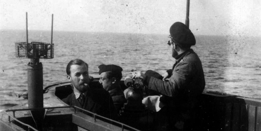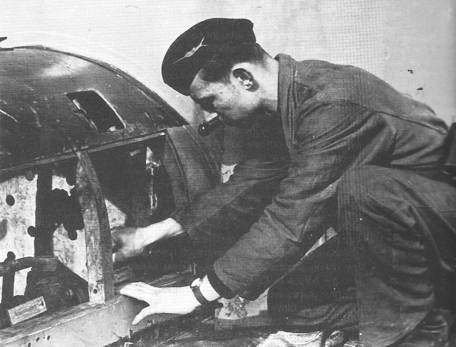 Un marinero ajustando el compás magnético. El compás magnético se encontraba alojado delante de la torreta. |