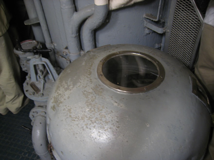 Ambos repetidores situados en el puente son a prueba de presión. El repetidor en la sala de control se puede mover a la estación principal auxiliar de control del timón, en la sala de torpedos de popa. Girocompás situado en la sala de control del U995. |
