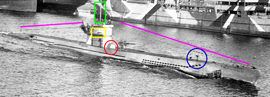 En esta imagen del U228, podemos apreciar justo encima del hidroplano, cuatro círculos metálicos. Se trata del "UT Anlage". |