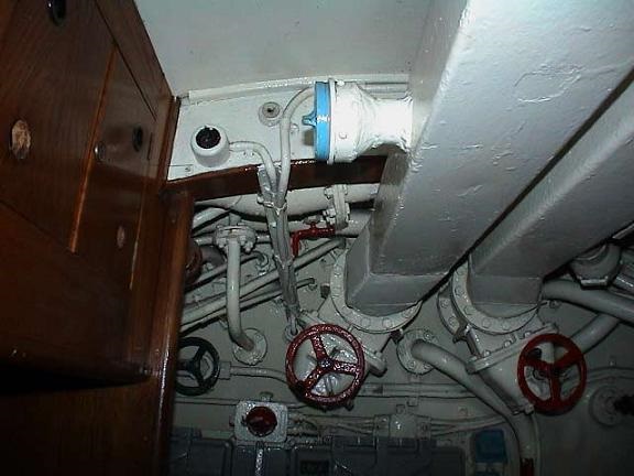 En cada compartimento hay ramas para conducto de admisión de aire y una rejilla de ventilación. Un conducto ramificado conduce a la torre de mando. También hay instalado un tubo que conduce a través del radiador para el desempañado del periscopio de ataque. Los tubos que van desde el conducto de escape son dirigidos al lugar más bajo en el compartimiento (CO2 es más pesado que el aire) y están provistos de válvulas de compuerta. Absorbentes de dióxido de carbono están conectados en la sala del motores eléctricos, sala de control y en la sala de torpedos de proa. Conductos de alimentación de emergencia de oxígeno también están conectados al conducto de aire de escape en la sala de máquinas diésel, sala de control y en la sala de torpedos de proa. Arriba (y a derecha e izquierda) líneas de ventilación de compartimentos y válvulas del U995. |