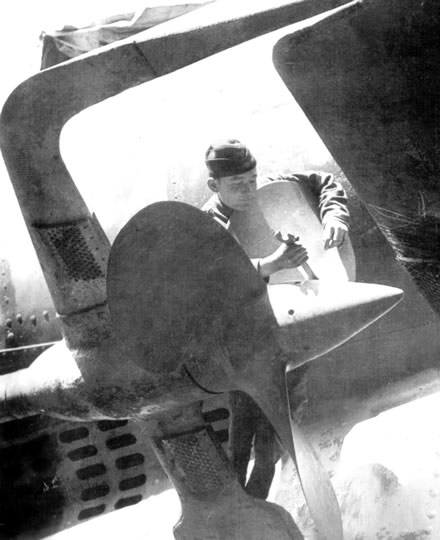 Los materiales son de fundición especial de bronce de grado "B" A la derecha vemos un mecánico ajustando una de las hélices. |