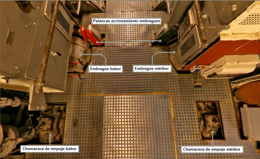 Embragues principales El eje de empuje y el eje del motor eléctrico, están conectados por medio del embrague principal, que se construye como un desembragable de doble embrague de cono de fricción . Se permite pequeños desplazamientos axiales de los ejes. El embrague principal, se opera manualmente para acoplar y desacoplar el eje de la hélice, al desplazar cada uno de dos conos de fricción sobre un manguito de dos partes. Embrague del motor diésel Se construye de modo igual al embrague principal, y sirve para desacoplar el motor diésel. El acoplamiento y desacoplamiento se realiza a través de un pistón de émbolo, con aire comprimido y aceite. En caso de fallo del pistón o de aire comprimido, el embrague puede ser operado a mano por medio de un volante. El par máximo es 8800 mkg [61.600 pies / libra]. |