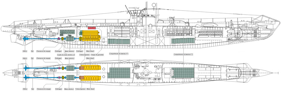 Al cargar con un eje cuya hélice se encuentra desembragada, el motor diésel acciona el motor eléctrico mediante el embrague del motor diésel. En este caso, el motor eléctrico funciona como generador y carga las baterías. Cuando la carga se lleva a cabo mientras el sumergible está en la superficie, navegando con los motores diésel, la potencia del motor diésel acciona la hélice. En este caso el régimen del motor diésel tiene un número constante de revoluciones, el motor o ambos motores eléctricos acoplado cargan las baterías. En este caso, el motor diésel debe proporcionar energía para la hélice y para impulsar el generador que realiza la carga. |