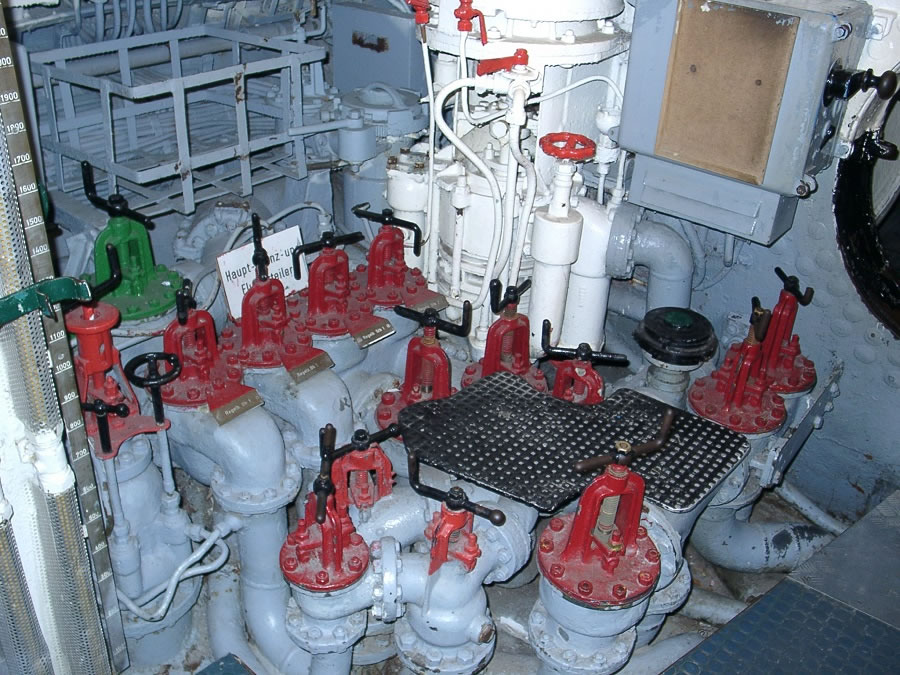 Los tanques de regulación y tanques de regulación y reserva de combustible La inundación se lleva a cabo por medio de la inundación del colector de drenaje, a través de la válvula de casco, desde el mar o para la inundación precisa con medidor de agua a través de la válvula de casco. Los tanques de compensación de torpedos 1, 2 y 3 Se inundan desde el mar, a través de las válvulas de casco, con medidor de agua en la sala de torpedos popa o la sala de torpedo de proa respectivamente. La inundación del pañol de municiones y contenedores de municiones También incluye las cargas explosivas, situadas en las salas de oficiales y suboficiales, así como el contenedor de bengalas. La inundaciónn se lleva a cabo a través de una conexión de manguera desde una válvula de casco situada en la sala de control. |