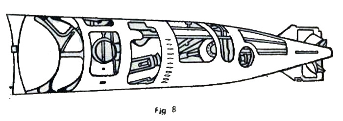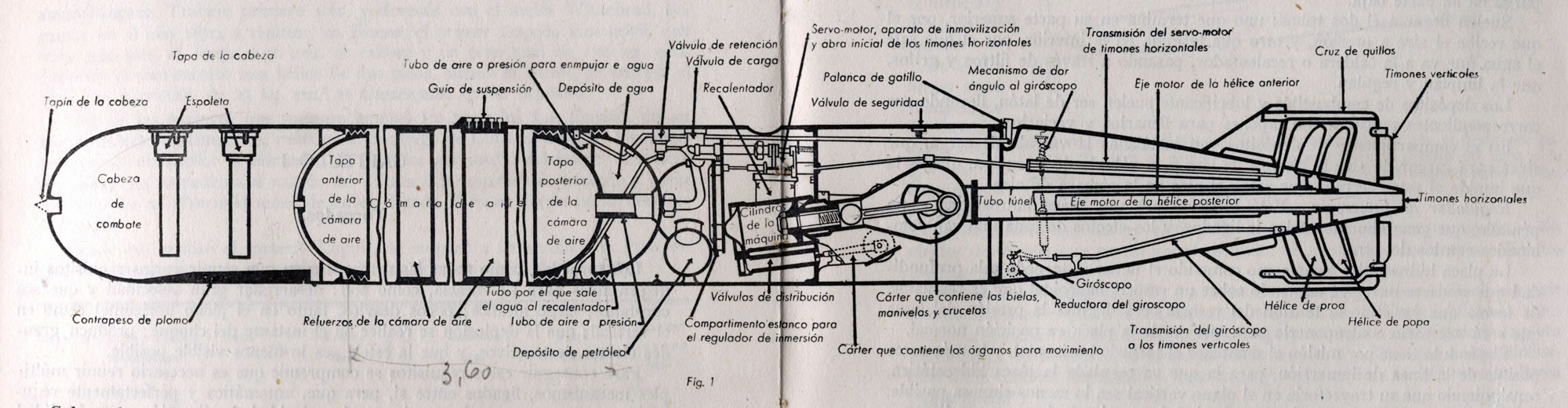 Máquina propulsora: El tipo de máquina empleado para la propulsión de los torpedos ha sido generalmente el Brotherhood, modificada por White-head a cuatro cilindros dispuestas en estrella a 96° uno de otro. Todas ellas suelen dar un rendimiento o muy parecido, y hoy día se han llegado a desarrollar potencias hasta de 450 caballos de vapor. |