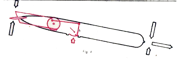 Mecanismo de inmovilización de los timones horizontales: De esta forma está el regulador de inmersión libre y trincados los timones en los primeros momentos que navega el torpedo a velocidades que van creciendo, y los efectos de inercia que perturban al péndulo, no ejercen su influencia sobre los timones horizontales.