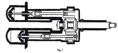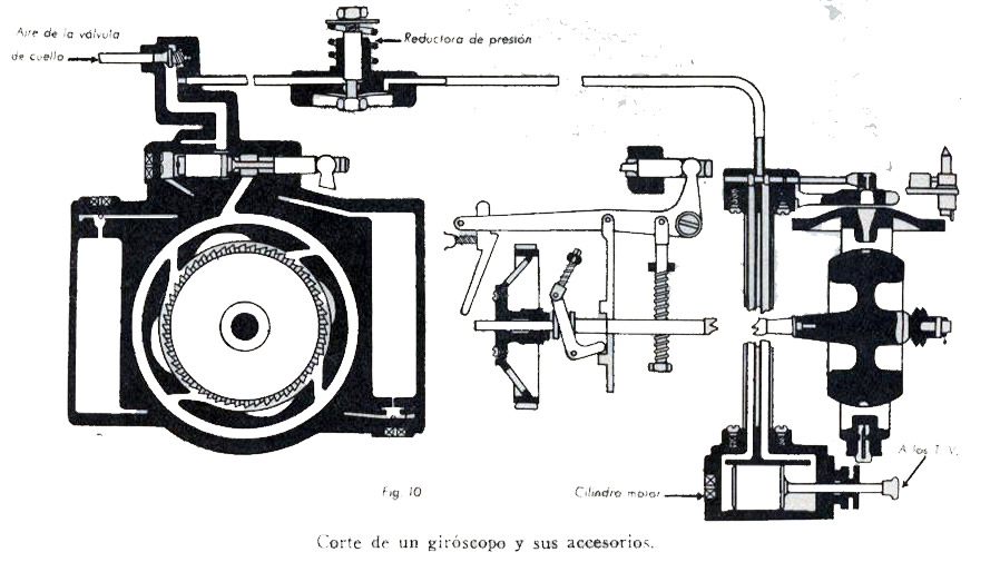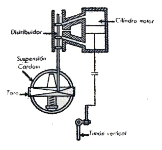 Dichas desviaciones se transmiten a un órgano movido por aire a presión llamado "cilindro motor", el cual multiplica el esfuerzo del giróscopo y manda a los timones verticales. |