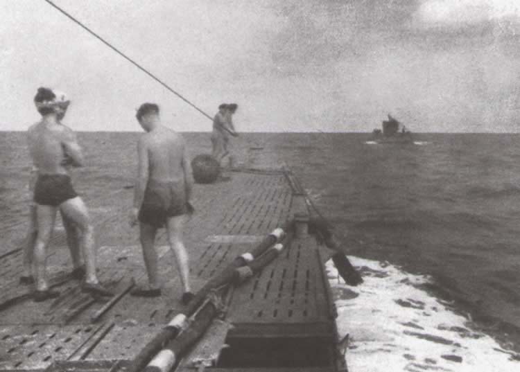 En los reabastecimientos realizados en alta mar la “vaca lechera” debía remolcar al uboot a reabastecer de combustible, entre ellos se tiraba una manguera que llevaba unida un cable telefónico. En algunos casos se tiraban dos mangueras, una para el combustible y otro para el lubricante. Una vez realizadas las conexiones los dos uboote iniciaban la marcha a unos 3 nudos de velocidad utilizando los motores eléctricos. |