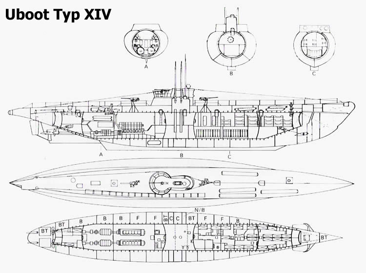 Los uboote del Tipo XIV debían disponer de una buena capacidad de almacenamiento combinado con una planta superior capaz de almacenar suministros, recambios, torpedos, botes y mangueras. Se tomo como base el Tipo Ixd, acortándolo, ampliándolo, haciéndolo más alto y de este modo aumentando considerablemente su capacidad y volumen interior. También se diseño una cubierta totalmente plana para facilitar los trabajos de reabastecimiento y de carga suministros. El nuevo diseño del Tipo XIV le permitiría transportar unas 430 toneladas de combustible, unas 45 toneladas de suministros y cuatro torpedos. Además disponían de una panadería capaz de producir 80 panes de un Kilo cada diez horas, todo un lujo. El primer uboot del Tipo XIV sería botado en Septiembre de 1941 y sería comisionado en Marzo de 1942. Para hacer su construcción más fácil y evitar los problemas de utilizar materiales y componentes de nuevo diseño, se utilizaron partes del Tipo VII y de otros uboote . Entre los componentes comunes entre los Tipo VII y XIV estaban todo el sistema de propulsión (motores diesel, eléctricos y maquinaria auxiliar) las escoltillas, las cabrestantes, el ancla y el sistema de bombeo. La torreta de los tipo XIV era exactamente la misma que los tipo IX. El casco de presión tenía un grosor de 21,5 Mm. que le permitiría una profundidad de inmersión mayor que la de los tipo VII y IX (su casco de presión tenía un grosor de 18,5 mm.). |