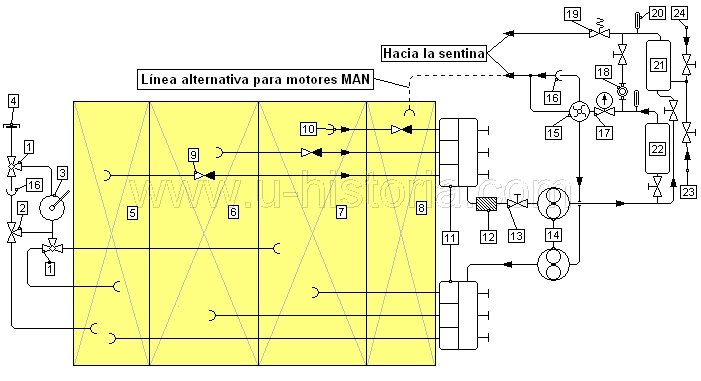 1.- Válvula de tres vías y dos pasos a escuadra, 2.- Válvula de tres vías y tres pasos en T, 3.- Bombillo manual, 4.- Toma para descarga del tanque de aceite sucio o de aceite limpio desde el tanque de aceite del motor de estribor, 5.- Tanque de aceite sucio, 6.- Tanque de aceite del motor de babor, 7.- Tanque de aceite del motor de estribor, 8.- Tanque de reboses de combustible, 9.- Válvulas de retención o no retorno, 10.- Aspiraciones y descargas desde y hacia tanques, 11.- Cajas de válvulas, 12.- Filtro, 13.- Válvula de paso recto, 14.- Bombas de aspiración y descarga, 15.- Depuradora o separador, 16.- Embudo, 17.- Caudalímetro, 18.- Mira de vidrio para controlar el paso de líquido, 19.- Válvula de seguridad, 20.- Termómetros, 21.- Precalentador de aceite lubricante limpio, 22.- Precalentador de aceite lubricante sucio. 23.- Entrada para agua de mar fría, 24.- Entrada para agua de mar caliente. |