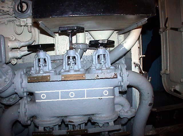 En la foto vemos tres círculos y unas líneas las líneas representan tabiques de separación los círculos tubos conectados por la parte posterior. Las salidas a la vista de la izquierda van hacia la bomba axial, de hélices o centrifuga los de la derecha van hacia la bomba manual y la caja de válvulas de enfriadores, la salida del círculo central blanco va hacia el filtro y válvula de la toma de llenado exterior, la del círculo blanco de la derecha va hacia las aspiraciones de los tanques de los motores, y el círculo de la izquierda va hacia la caja de válvulas de llenado de los tanques almacén. |