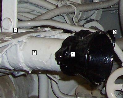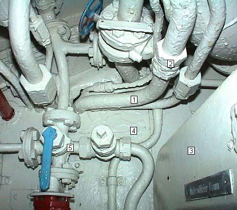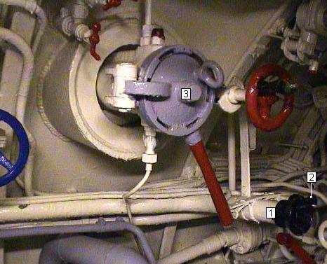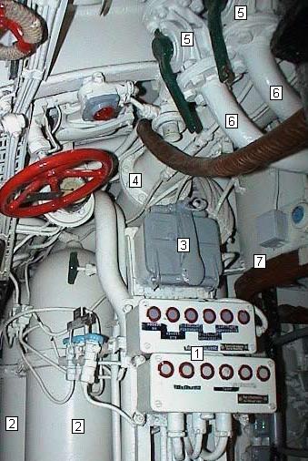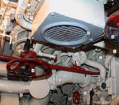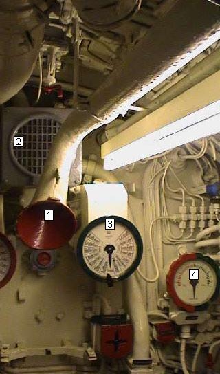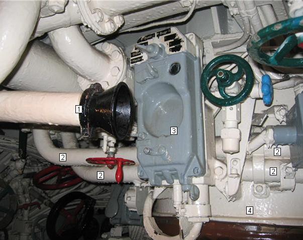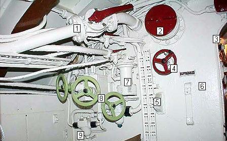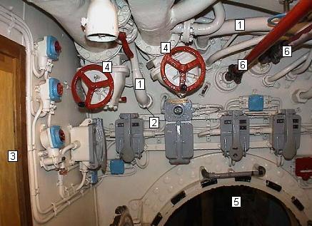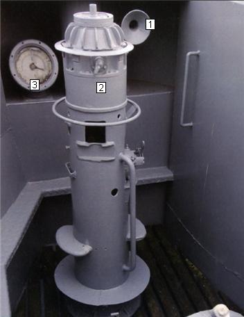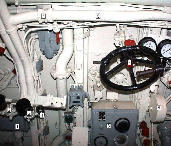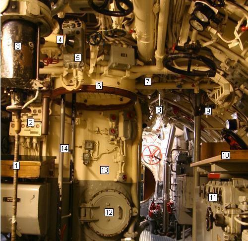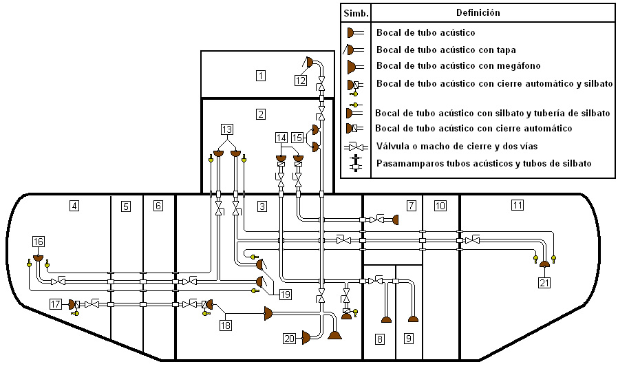 1.- Puente, 2.- Torre, 3.- Central, 4.- Sala de torpedos de popa y motores eléctricos, 5.- Sala de motores diesel, 6.- Sala suboficiales y cocina, 7.- Cámara del comandante y tubo acústico, 8.- Sala de radio y tubo acústico, 9.- Sala de hidrofonía o escucha y tubo acústico, 10.- Sala de oficiales, 11.- Sala de torpedos de proa, 12.- Bocal y tubo acústico en el puente, 13.- Bocales y tubos acústicos en torre hacia mesa de mapas y salas de torpedos, 14.- Bocales y tubos acústicos en torre hacia Central, Sala de radio y sala de escucha el de la izquierda y hacia el camarote del comandante el de la derecha, 15.- Bocales y tubos acusticos procedentes del puente hacia central, 16.- Bocal junto a tubos lanzatorpedos de popa, 17.- Bocal para órdenes e incidencias relacionadas con los motores eléctricos, 18.- Bocales del oficial de inmersión, 19.- Bocales sobre mesa de mapas, 20.- Bocal-megáfono para transmitir órdenes al timonel, 21.- Bocal junto a tubos lanzatorpedos de proa. |