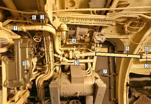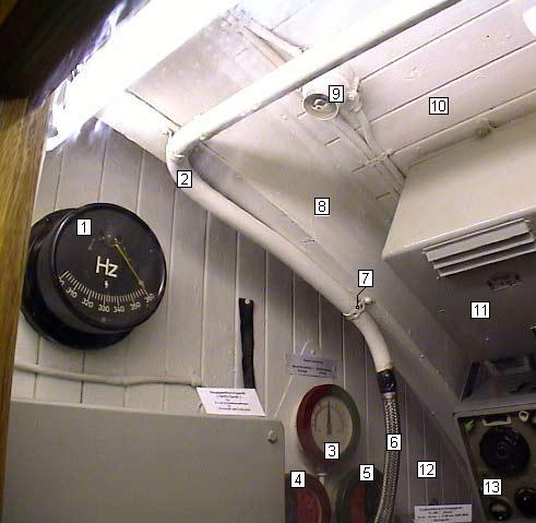 1.- Frecuencímetro, 2.- Tubo acústico rígido, 3.- Indicador de ángulo de metida de los timones, 4.- Indicador de revoluciones de los motores de babor, 5.- Indicador de revolociones de los motores de estribor, 6.- Tubo acústico flexible, 7.- Cinta multifix para sujetar el tubo acústico, 8.- Embonado de madera que cubre la cuaderna, 9.- Conmutador de circuito electrico, 10.- Embonado del casco, 11.- Fuente de alimentación, 12.- Embonado del mamparo, 13.- Emisor de radar FuMO 61. |
