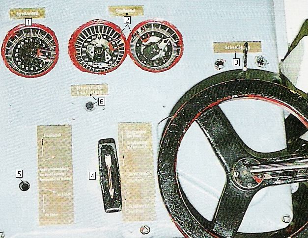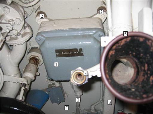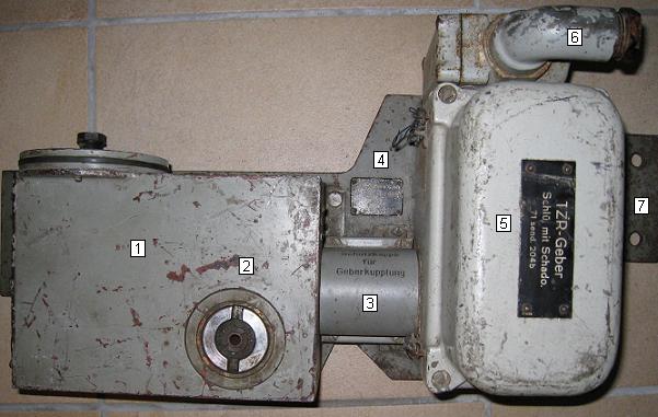 1.- Caja de mecanismos, 2.- Acoplamiento para eje exterior, 3.- Tapa de protección del embrague (traducción de las letras pintadas en la misma), 4.- Placa que pone lo que es el conjunto (Steuerkasten > Caja de control) 5.- Caja de los elementos eléctricos que transforman los movimientos mecánicos, transferidos de la Caja de mecanismos, en señales eléctricas, 6.- Tubo para el cable de transmisión eléctrica de datos, 7.- Orejeta de soporte del aparato |
