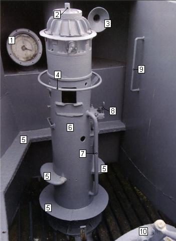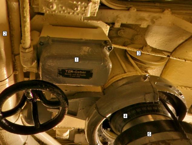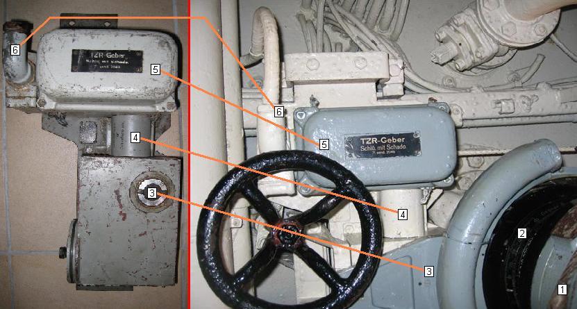 1.- Cable de izado/calado de periscopio, 2.- Corona graduada en grados, 3.- Caja de acoplamiento entre el periscopio y el TZR, 4.- Tapa de protección del embrague, 5.- Caja de los elementos eléctricos que transforman los movimientos mecánicos, transferidos de la Caja de mecanismos, en señales eléctricas, 6.- Tubo para el cable de transmisión eléctrica de datos, (para conocer el TZR con más detalle ver servo TZR). |