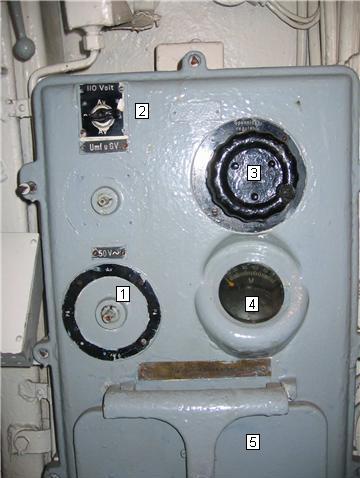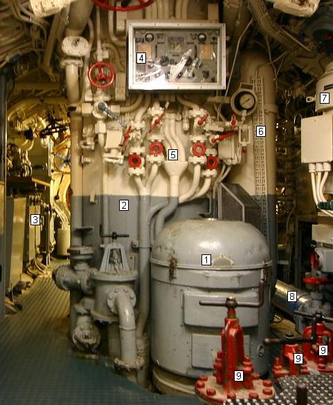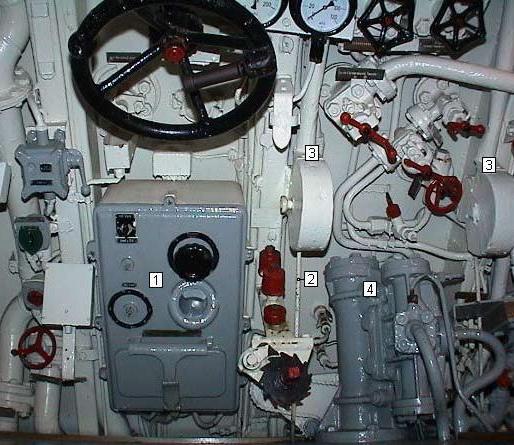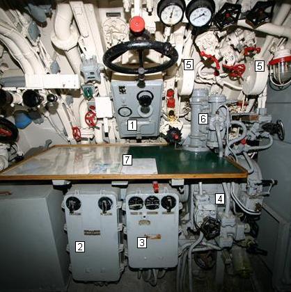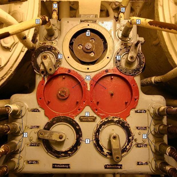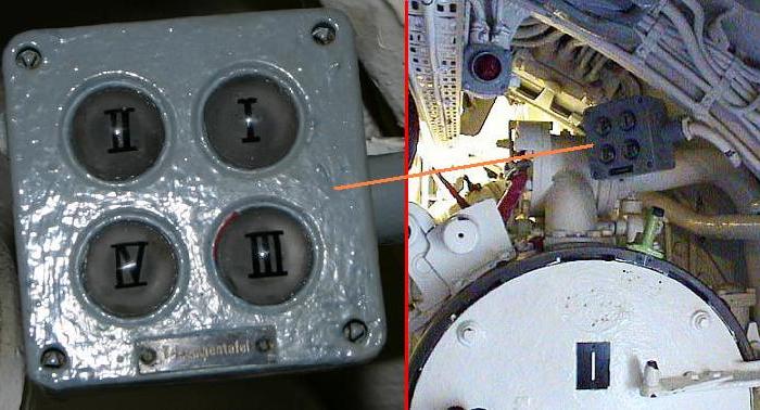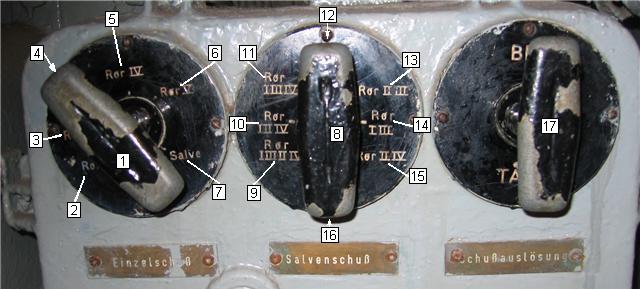 El la central o torre (depende de cada sumergible o tipo) y en cada una de las salas de torpedos habia unos paneles de lámparas, en el de la central o en el de la torre esos paneles y para los sumergibles del tipo VII tenían 5 lámparas que al estar encendidas indicaban cuando los tubos lanzatorpedos estaban cargados y listos para el disparo. |